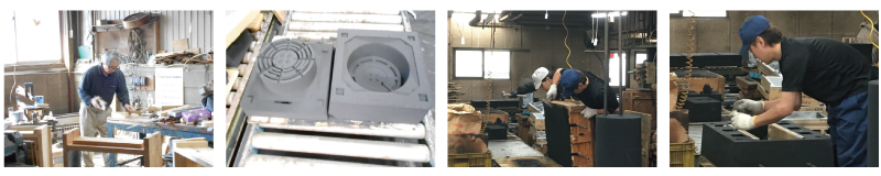 鋳物(いもの)とは、加熱して溶かした金属を型に流し込み、冷えて固まった後、型から取り出して作った(鋳造)金属製品のことです。鋳造しようとする形状を木で作った木型を用意することが一般的ですが、この木型も自社の職人によってどんな形状でもご用意することが可能です。この木型を利用し酸硬化性・熱硬化性の樹脂、粘結剤を加えた砂で型をとります。これを砂型と呼びます。